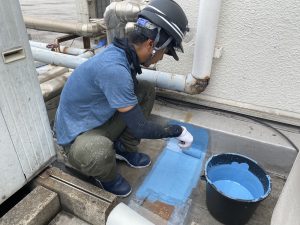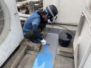 下地処理後、プライマーを塗布し、補強布を積層することで防水層の強度と耐久性を向上。