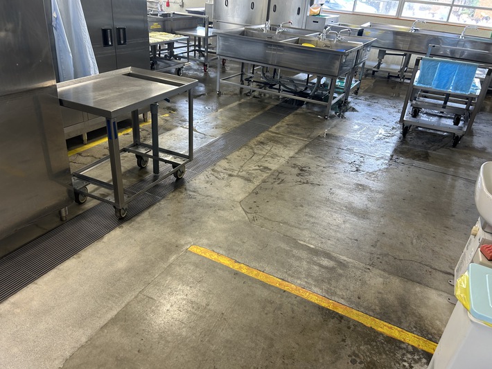 稲沢市小学校 給食室改修工事 |次の事例へ >> 一覧に戻る ポイント 愛知県内/小学校 給食室改修工事/厚膜型エポキシ系塗床(ユータックE-30N)老朽化が進んでいた小学校の給食室床改修工事を実施しました。長年の使用により、床面にひび割れや汚れ、光沢の低下が見られたため、耐久性・衛生性・清掃性を重視した仕様で改修を行いました。 ギャラリー ※クリックすると画像が拡大されます。 |次の事例へ >> 一覧に戻る